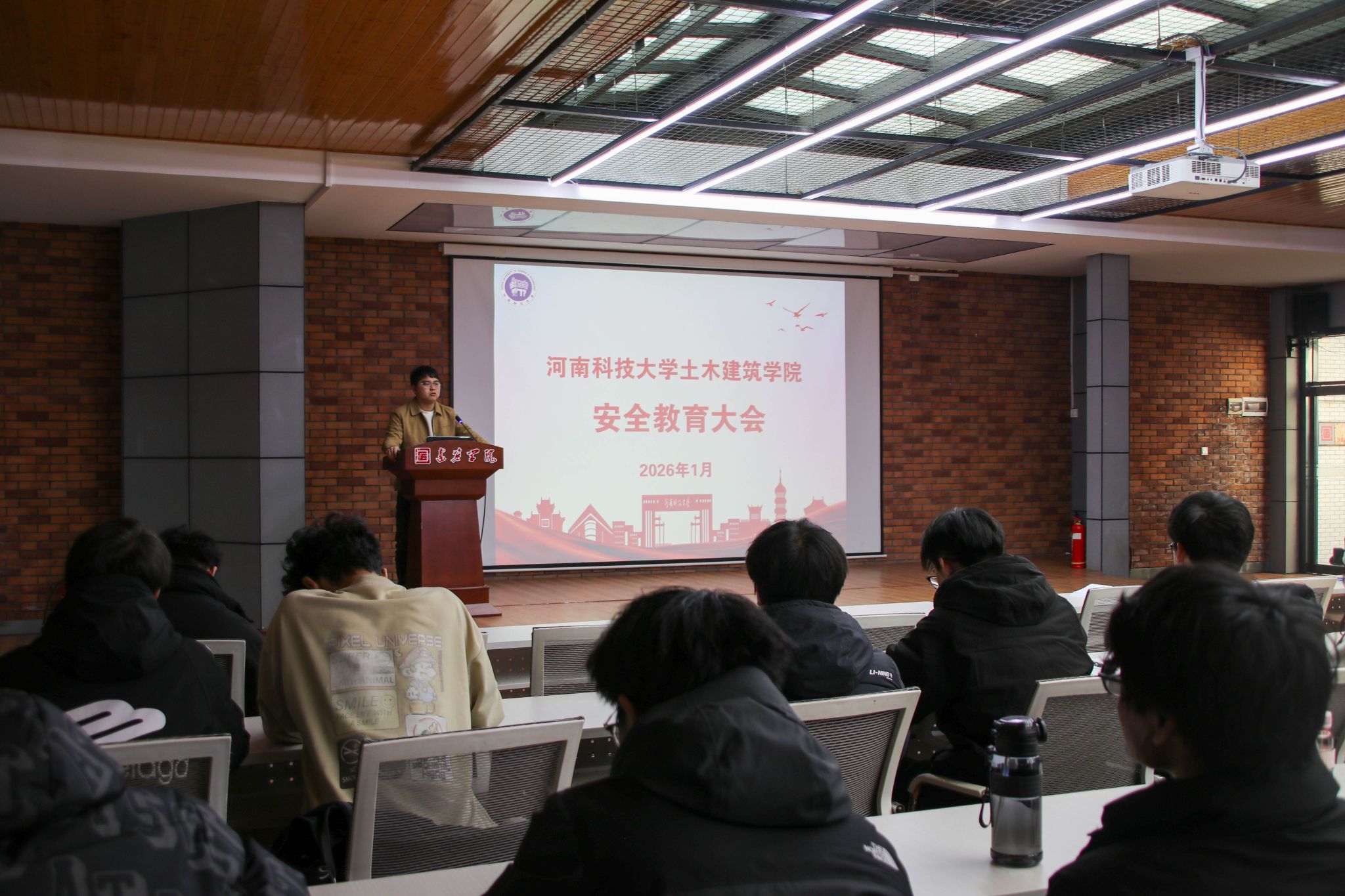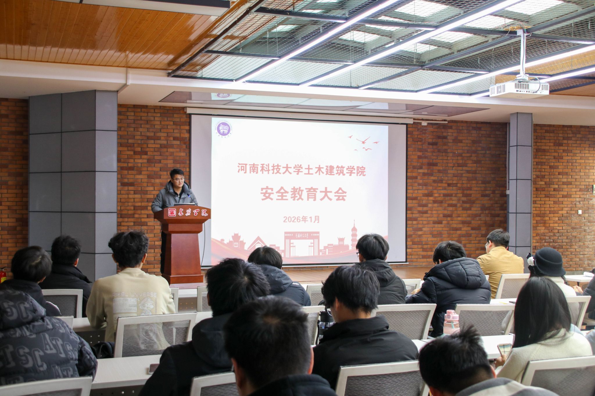 为深入推进校园安全工作部署,切实强化学生安全防范意识,2026年1月15日,土木建筑学院在工科三报告厅召开学院安全教育大会,学院党委副书记陈洁、团委副书记陈仲弘、25级辅导员贺自豪、21级辅导员乔明磊出席本次大会,学院各年级学生代表参会,会议由乔明磊老师主持。