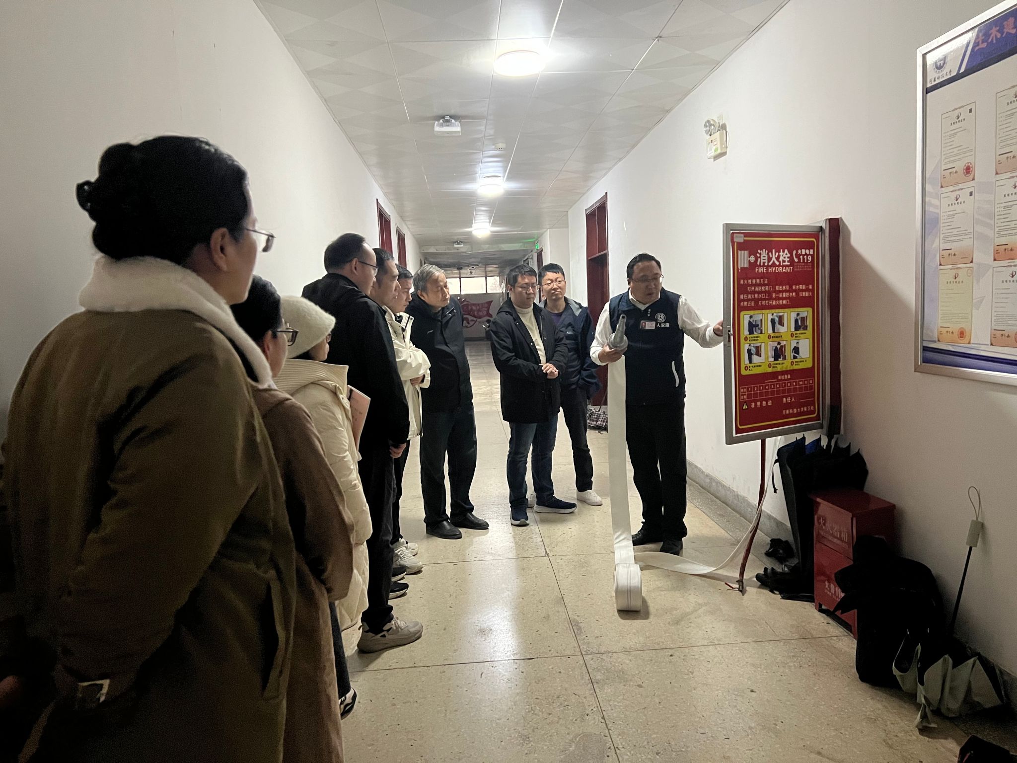 会上,董方旭通过近年来的多起消防安全事故真实案例,借助图片、视频资料等,详解了火灾成因、预防措施及火场逃生技能。会后,董方旭和师生们来到学院三楼走廊,现场讲解了消火栓的使用方法以及如何有效扑灭初期火灾。