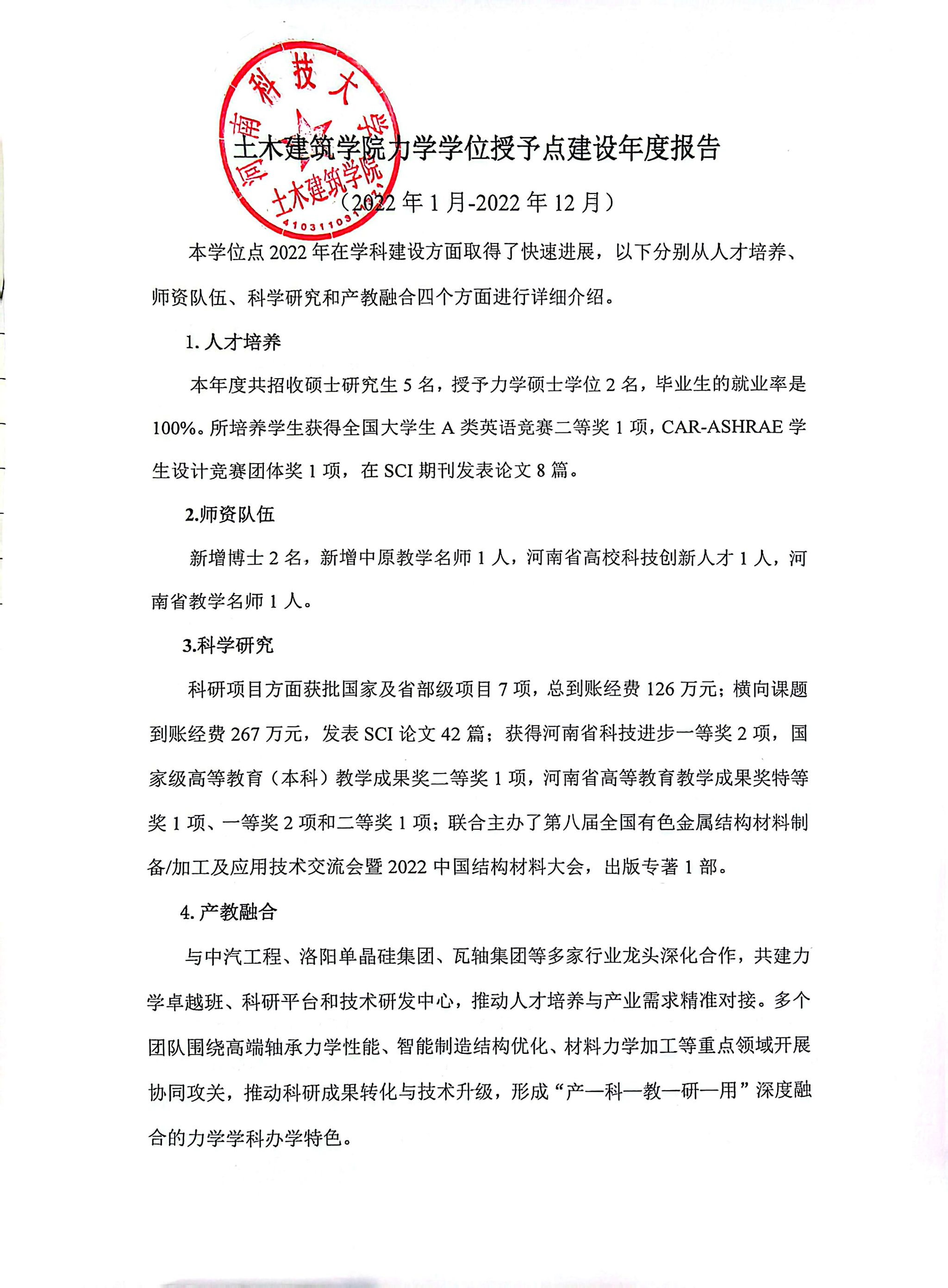 河南科技大学土木建筑学院力学学位授予点建设年度报告(2022年)